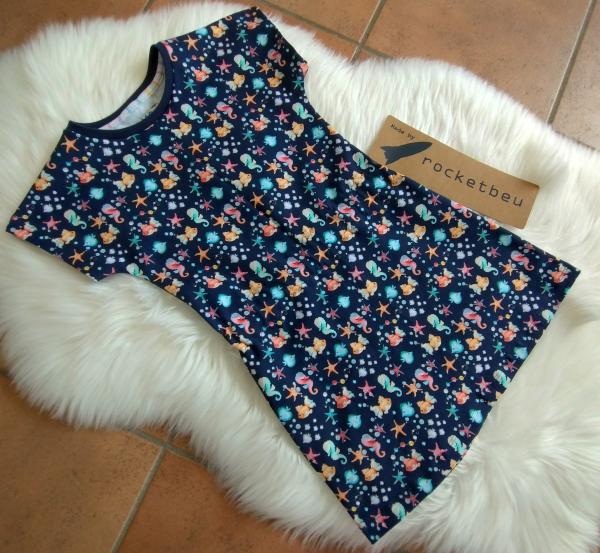 Ein tolles Sommerkleid mit Meerestieren-Motiv. Dieses tolle Kleid ist ein Begleiter für das ganze Jahr. Im Herbst und Winter kann man gut ein Langarmshirt unter ziehen und somit ist es das ganze Jahr tragbar. Auch wächst es gut mit. Am Anfang ist es ein Kleid, später dann eine Tunika.