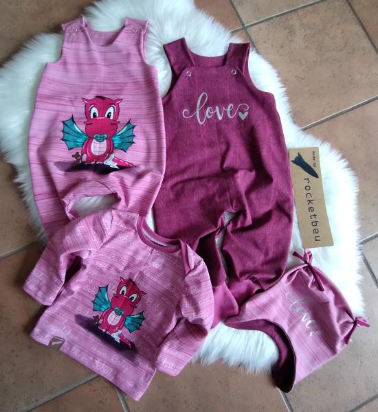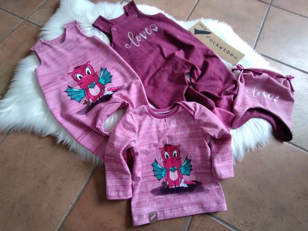 Wunderschönes Set aus Strampler mit süßem Drachen-Motiv, einer Strampellatzhose in beere Jeansoptik, passender Ohrenmützchen KU 42-44 und Langarm Shirt mit dem kleinen süßen Drachen.
