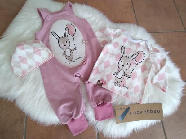 Süße Latzhose für Mädchen aus einem weichen Jerseystoff in Jeansoptik mit Hasen Applikation. Dazu ein passendes Langarmshirt mit Hasen-Motiv und eine passende Mütze KU 42.