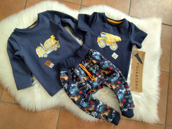 Wunderschönes Set aus Jersey Langarm-Shirt mit Betonmischer-Motiv, T-Shirt mit Lastwagen-Motiv und Pumphose mit echten Taschen aus Jerseystoff.