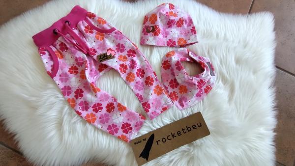 Tolle Hose für die Kleinsten, bequem, weit und ohne Teilung, damit die Motive der Stoffe besser zur Geltung kommen. Aber mit echten Taschen, zum verstauen der wichtigen gesammelten Dinge. Dazu eine passende Mütze mit Kopfumfang 44 cm und ein passendes Dreieckstuch.
