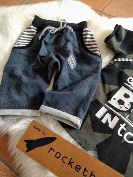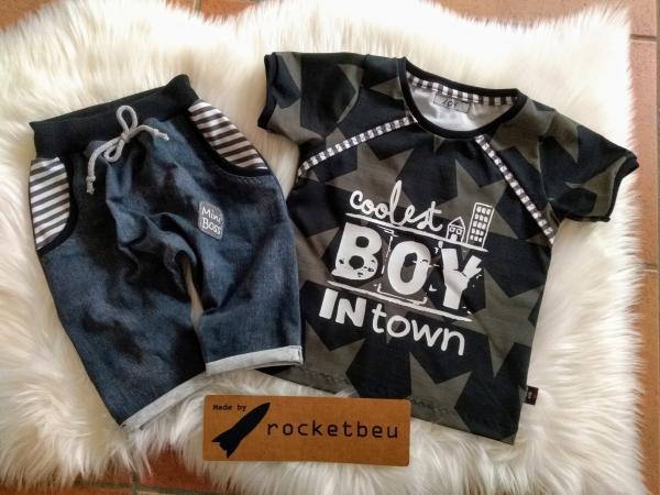Ein tolles Sommerset für coole Jungs. Bestehend aus einem T-Shirt mit einem weißen Plott. Dieser wurde mit einer Presse aufgebracht. Komplett macht das Set eine coole kurze Hose aus Jersey in Jeansoptik.