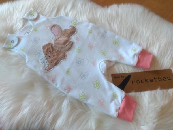 Handgefertigter Strampler mit süßem Hasen-Motiv. Der Strampler ist aus weichem Jersey Stoff genäht. Er ist mit Zwickel genäht und hat keine Wickelöffnung.