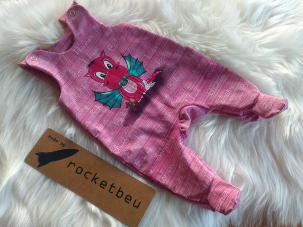 Handgefertigter Strampler mit süßem Drachen-Motiv. Der Strampler ist aus weichem Jersey Stoff genäht. Er ist mit Zwickel genäht und hat keine Wickelöffnung. Jedoch ist er mit Füßen genäht.