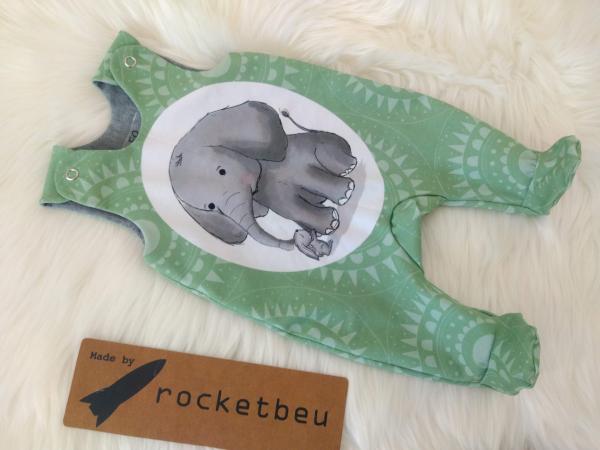 Handgefertigter Strampler mit süßem Elefant-Motiv. Der Strampler ist aus weichem Jersey Stoff genäht. Er ist mit Zwickel genäht und hat keine Wickelöffnung. Jedoch ist er mit Füßen genäht.