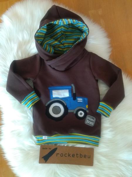 Ein toller Hoodie mit Kuschelkraputze und coolem Traktor Stickmotiv. Aus Eike Ganzjahressweat genäht. D:h. er ist innen kuschelig angeraut.