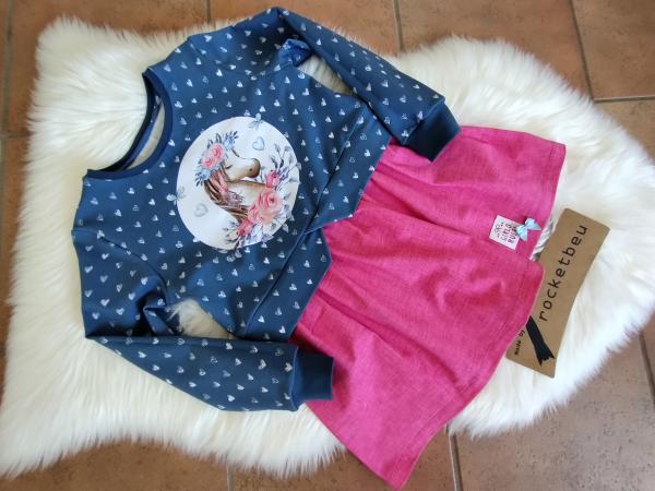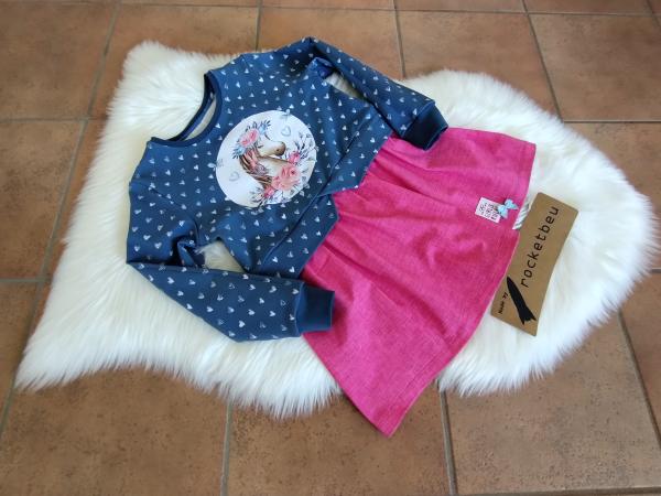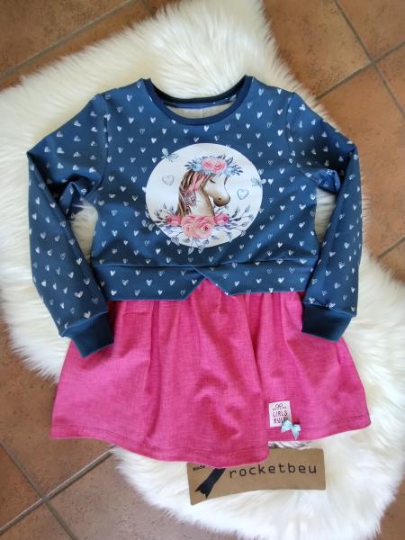 Der Pullover ist aus weichem French Terry Stoff in blau genäht, der weich und dehnbar ist. Unten das Schößchen aus weichem Jersey in pink.