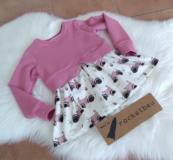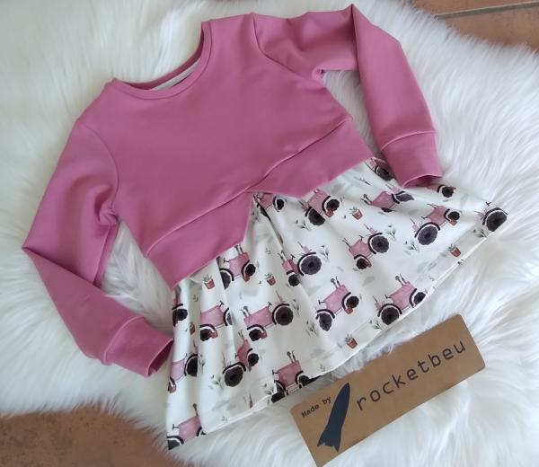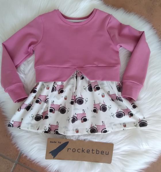 Der Pullover ist aus weichem beere farbenen Jerseystoff genäht, der weich und dehnbar ist. Unten das Schößchen aus weichem Jersey mit Traktor-Motiv.